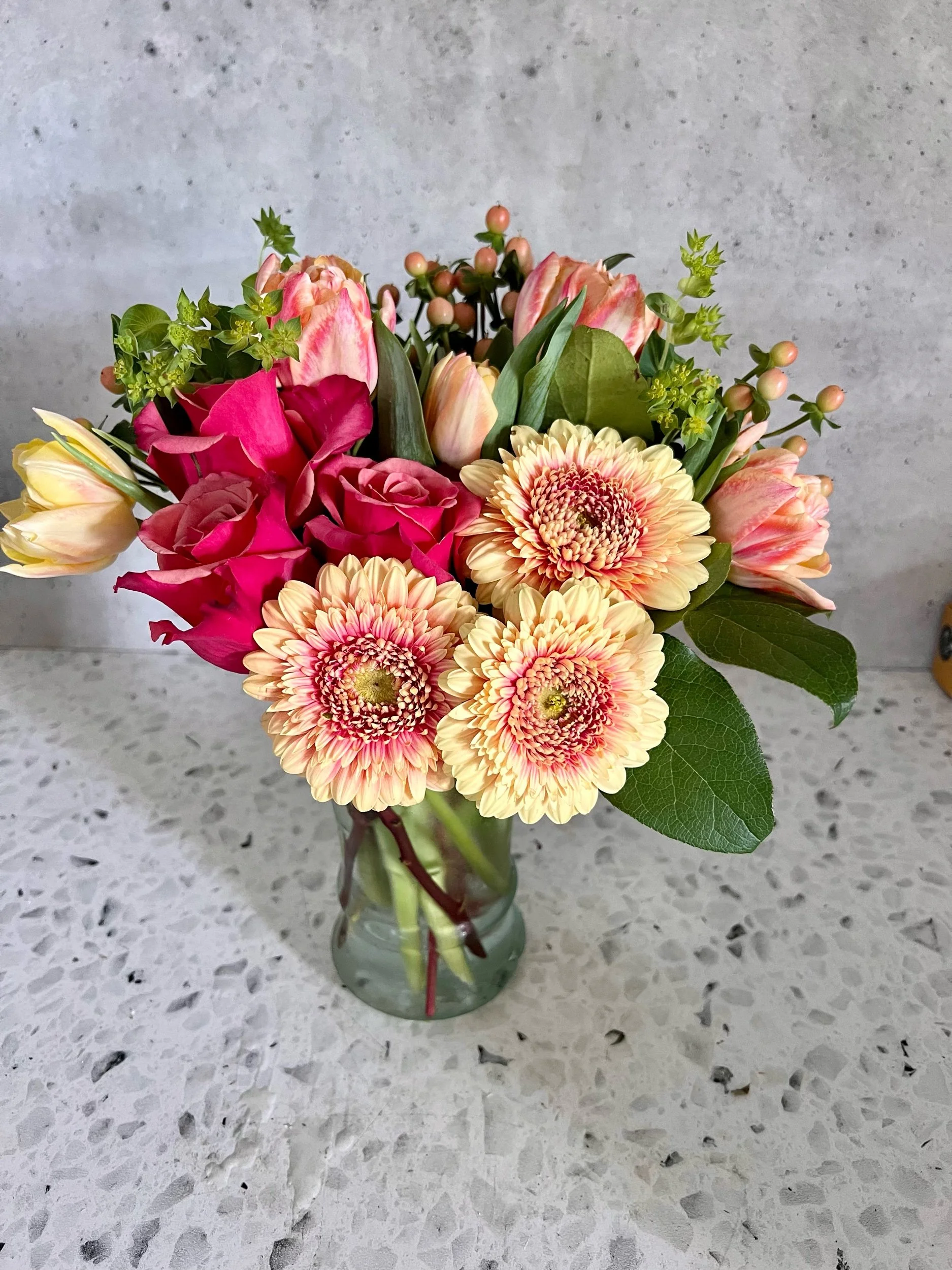 Brighten up anyone’s day with this warming gathering of ‘cold brew’ roses, two toned gerbera daisies, lilium tulips, buplereum and pussywillows